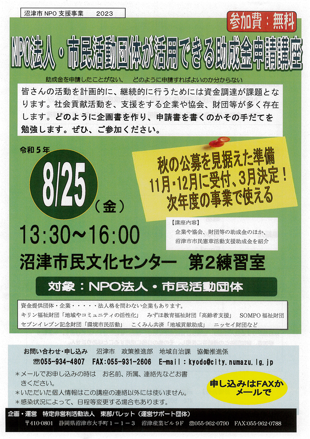 内 容:企業や協会、財団等の助成金のほか、沼津市市民憲章活動支援助成金を紹介